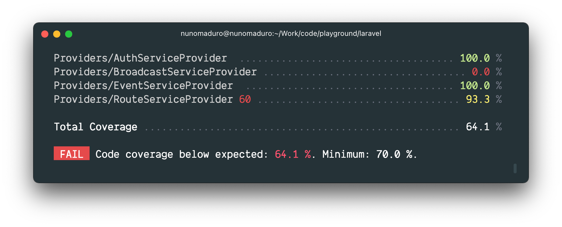 In addition, if you would like to specify a minimum threshold that your test coverage percentage must meet, you may use the --min option. The test suite will fail if the given minimum threshold is not met: