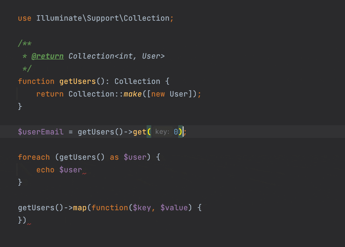 Laravel 9.x adds improved, "generic" style type definitions to the collections component, improving IDE and static analysis support. IDEs such as PHPStorm or static analysis tools such as PHPStan will now better understand Laravel collections natively.